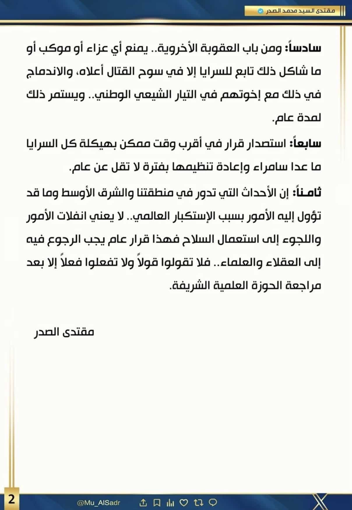 الصدر يصدر توجيهات عاجلة إلى سرايا السلام