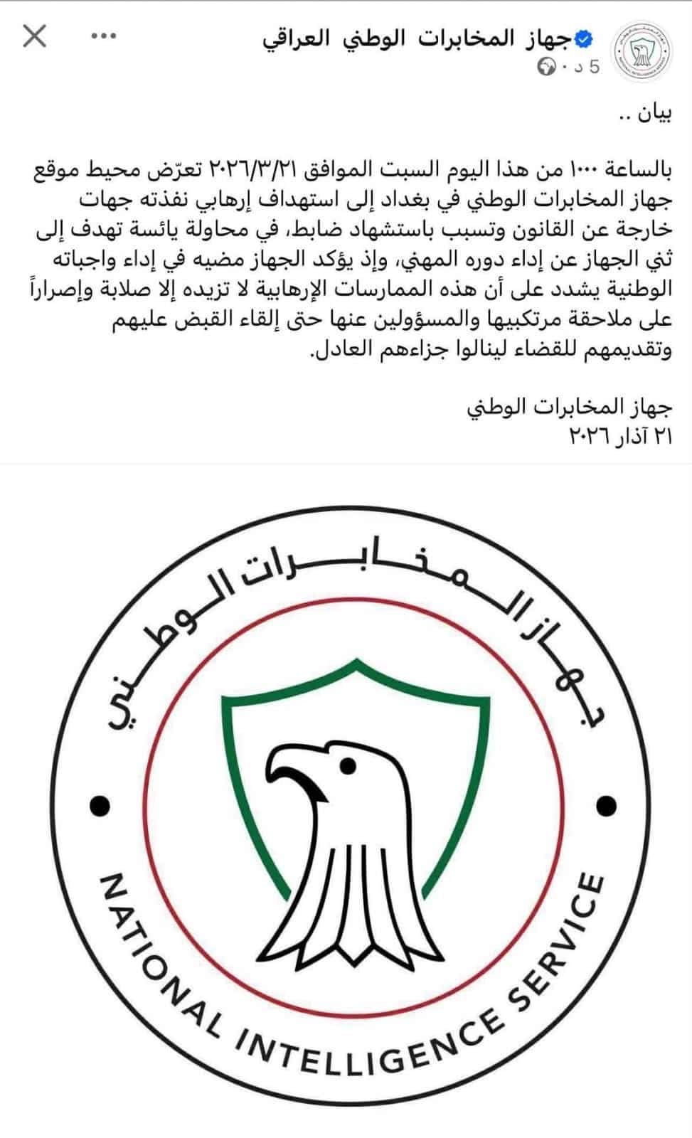 دائرة المخابرات الوطنية العراقية تعلن اسـّشهاد ضابط باستهداف مسيره لموقع الجهاز وسط بغداد قبل قليل وتتوعد بملاحقة المتورطين فيه.